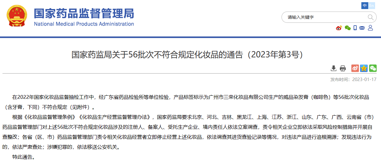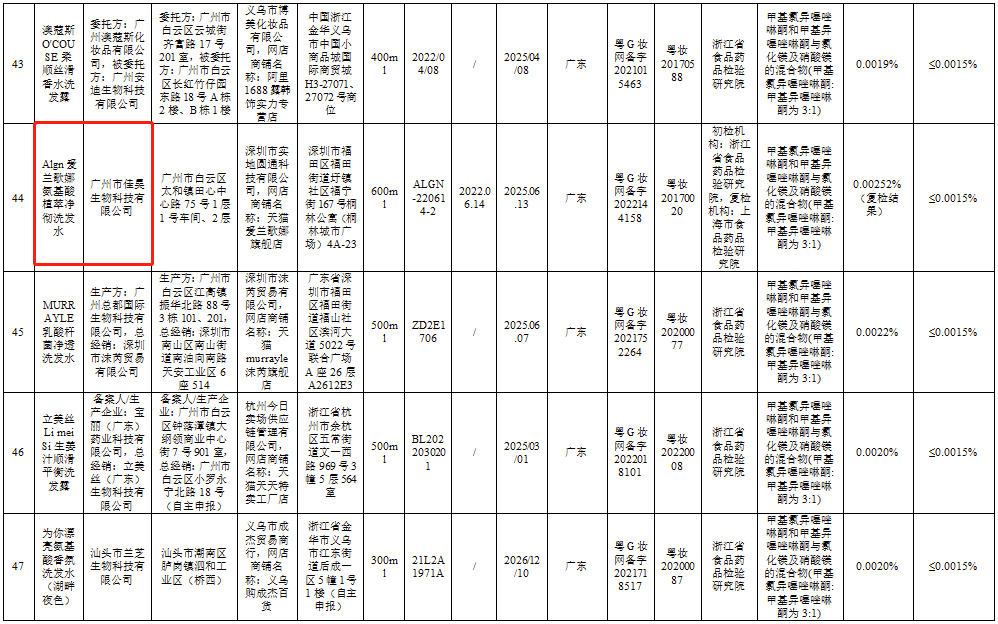 此外在本年1月17日,国家药品监督管理局发布的56批次不符合规则化妆品的通告(2023年第3号),其间,广州市佳昊生物科技有限公司所出产的Algn爱兰歌娜氨基酸植萃净彻洗发水因不符合规则而遭到通报。