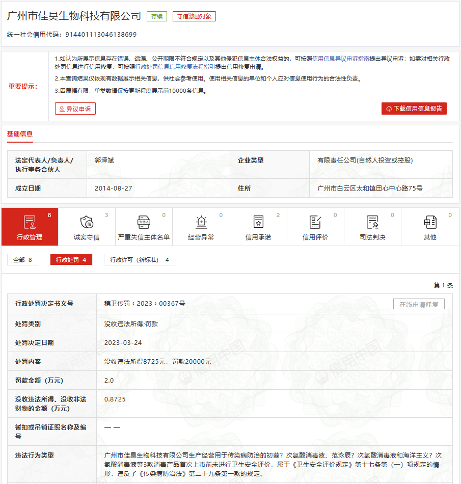日前,信誉中国显现,广州市佳昊生物科技有限公司(简称:佳昊生物)于2023年3月24日因违背《流行症防治法》,被广州市卫生健康委员会处分。具体违法现实如下: