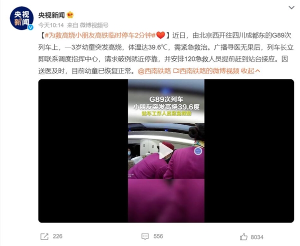 4月6日消息,微博话题“为救高烧幼童高铁破例停车2分钟”上了热搜榜。