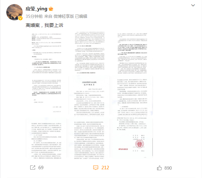 此前,应莹曾发文称,收到了上海黄浦区人民法院的离婚案判定书。据她介绍,从2019年3月底递送起诉状要求离婚到拿到判定书,历时整整四年,黄浦区人民法院总算给了一个成果:原告应莹要求与被告徐翔离婚的诉讼恳求,不予支撑。