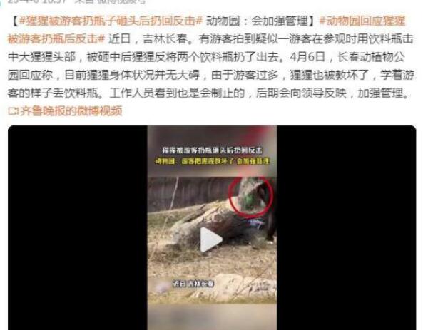 近日,吉林长春。有游客拍到疑似一游客在参观时用饮料瓶击中大猩猩头部,被砸中后猩猩反将两个饮料瓶扔了出去。4月6日,长春动植物公园回应称,目前猩猩身体状况并无大碍,由于游客过多,猩猩也被教坏了,学着游客的样子丢饮料瓶。工作人员看到也是会制止的,后期会向领导反映,加强管理。