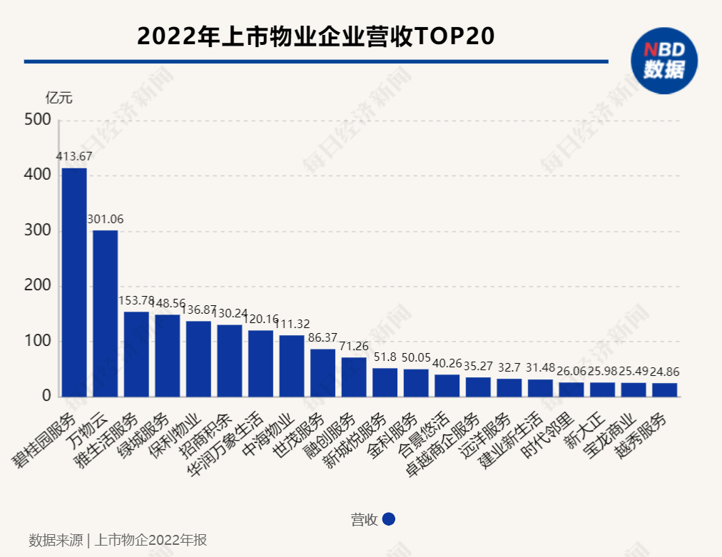 《每日经济新闻》记者计算发现,2022年上市物企营收在100亿元以上的有8家,200亿元以上的仅有2家。其间,碧桂园服务以413.67亿元大幅领跑,万物云以301.06亿元紧随其后。