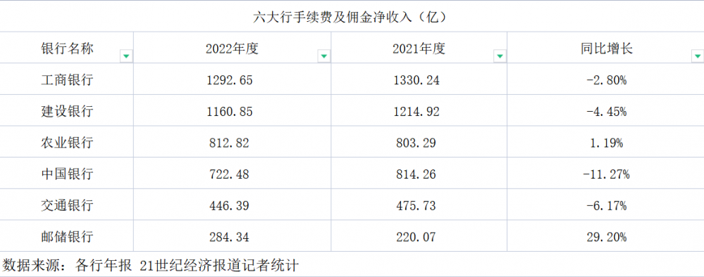 年报数据显现,2022年内,工商银行依然以1292.65亿元的中收居首,紧随其后的是建造银行,全年完成中收1160.85亿元。农行、中行、交行和邮储的中收规划均未到达千亿水平,其间邮储银行中收规划最小,为284.34亿元。