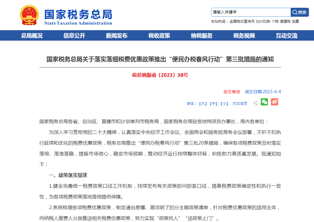 国家税务总局推出2023年“便民办税春风行动”第三批办法