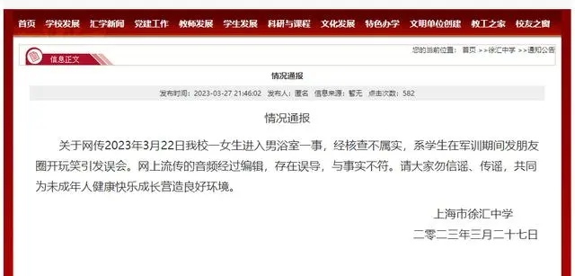3月27日晚,上海市徐汇中学网站发布情况通报:关于网传2023年3月22日我校一女生进入男浴室一事,经核查不属实,系学生在军训期间发朋友圈开玩笑引发误会。网上流传的音频经过编辑,存在误导,与事实不符。请大家勿信谣、传谣,共同为未成年人健康快乐成长营造良好环境。