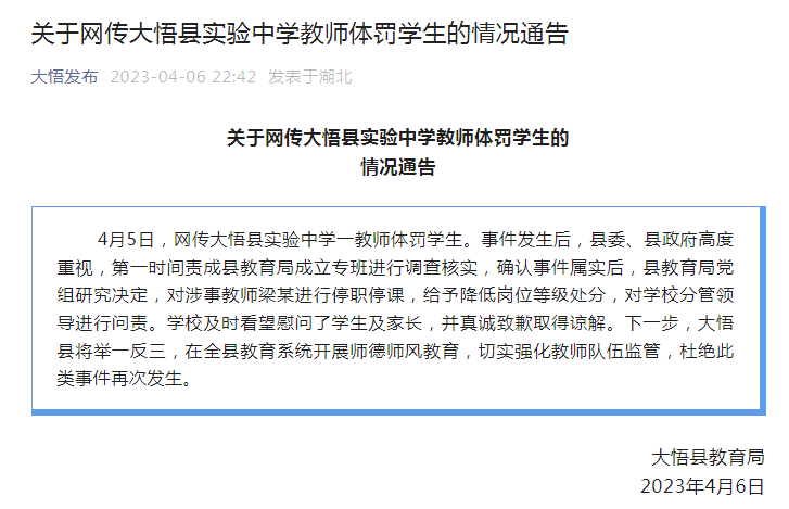 近日,一段老师在教室左右开弓扇学生耳光的视频在网上引发关注。湖北孝感大悟县教育局4月6日晚通报,4月5日,网传大悟县实验中学一教师体罚学生。事件发生后,县委、县政府高度重视,第一时间责成县教育局成立专班进行调查核实,确认事件属实后,县教育局党组研究决定,对涉事教师梁某进行停职停课,给予降低岗位等级处分,对学校分管领导进行问责。学校及时看望慰问了学生及家长,并真诚致歉取得谅解。下一步,大悟县将举一反三,在全县教育系统开展师德师风教育,切实强化教师队伍监管,杜绝此类事件再次发生。