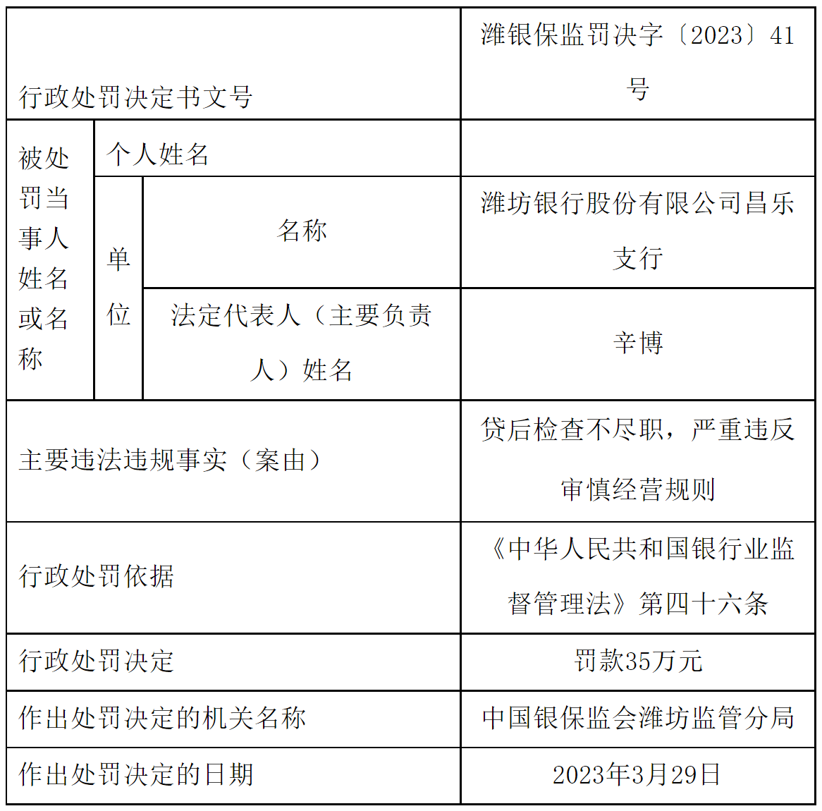 潍坊银行昌乐支行被罚35万元:贷后查看不尽职,严峻违背