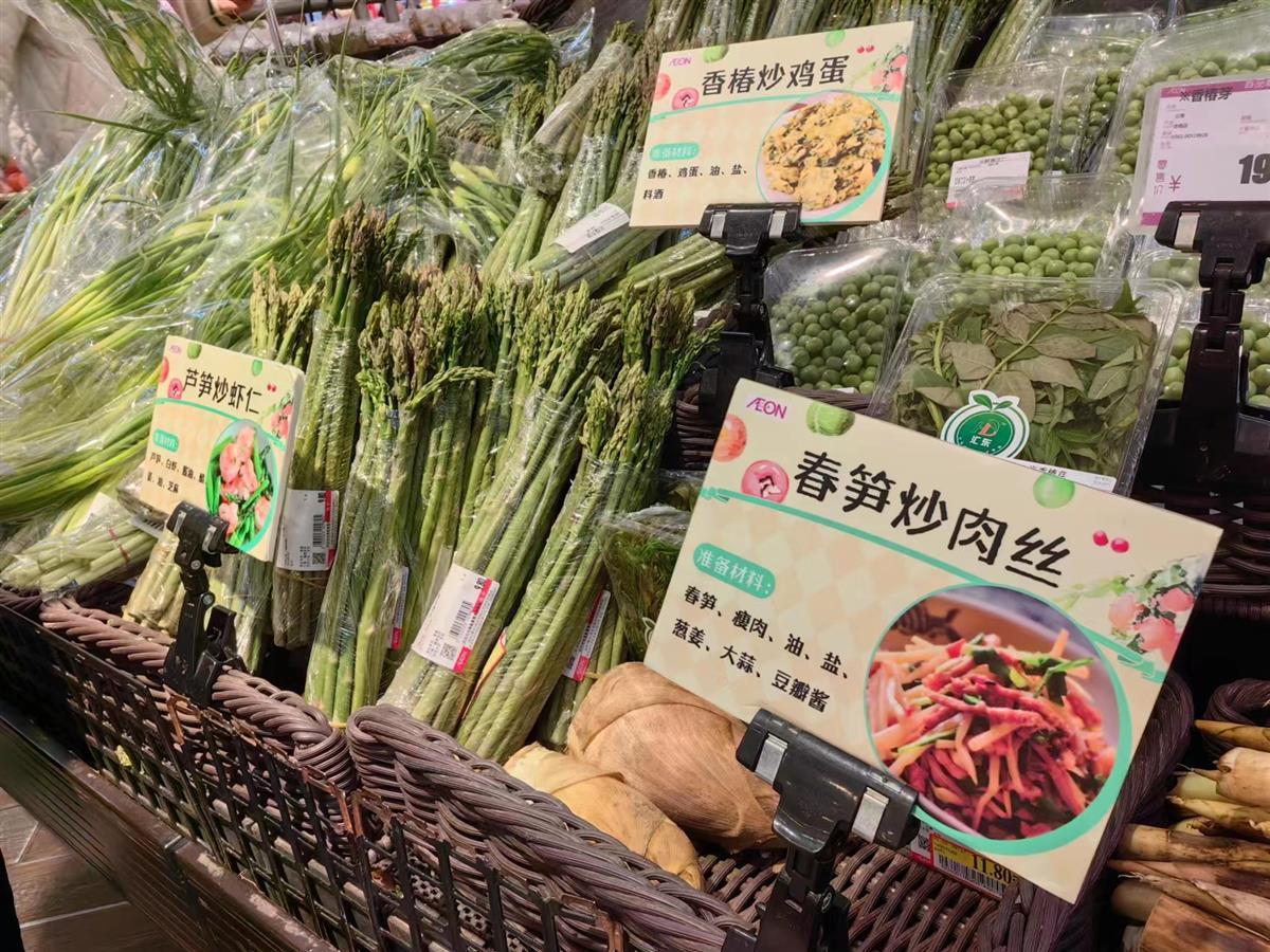 比方,在时下最时令的蔬菜——春笋的货架上就插着一块“春笋炒肉丝”的“烹饪教程图”。