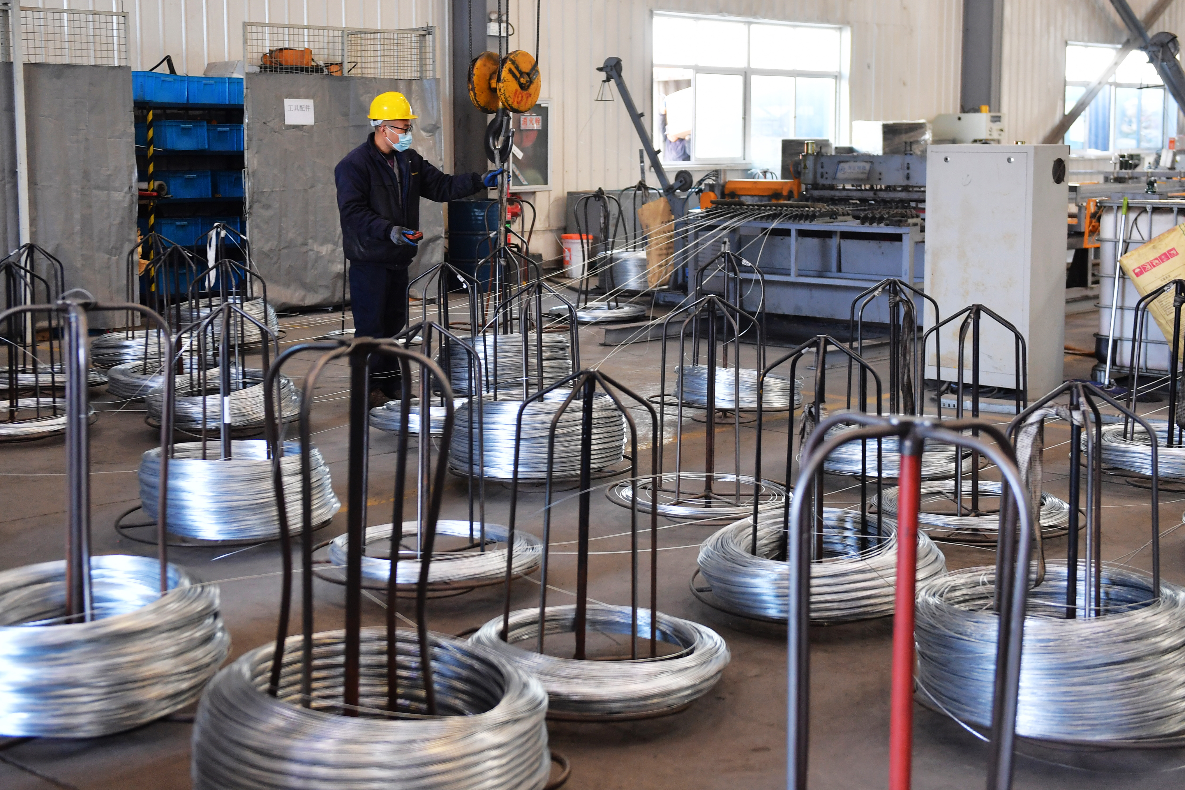 4月7日,在青岛市城阳区流亭大街工业园的一家智能化饲养配备企业出产车间内,工作人员在吊装出产资料。王海边摄