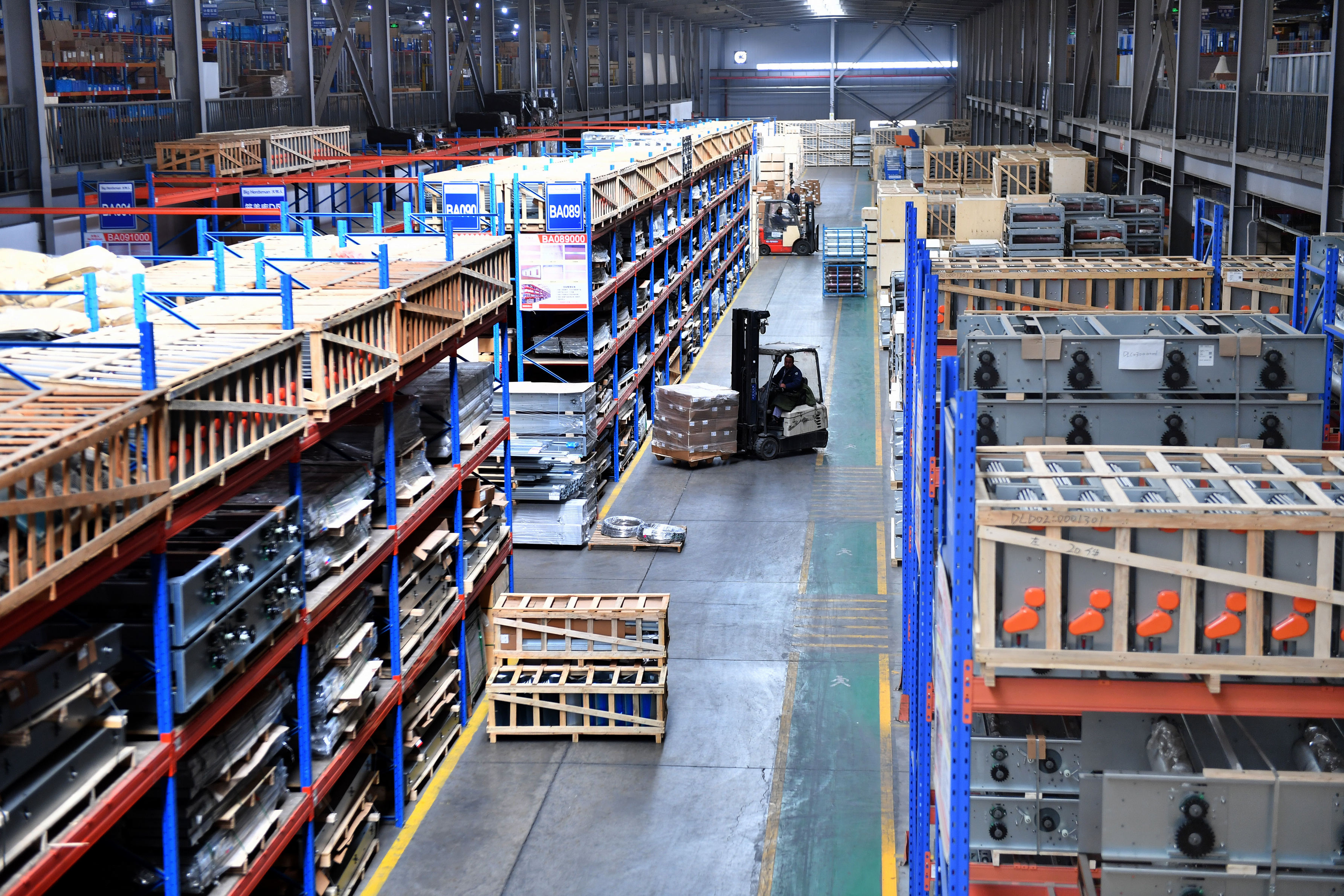 4月7日,在青岛市城阳区流亭大街工业园的一家智能化饲养配备企业库房内,工作人员在摆放预备外销的产品。王海边摄