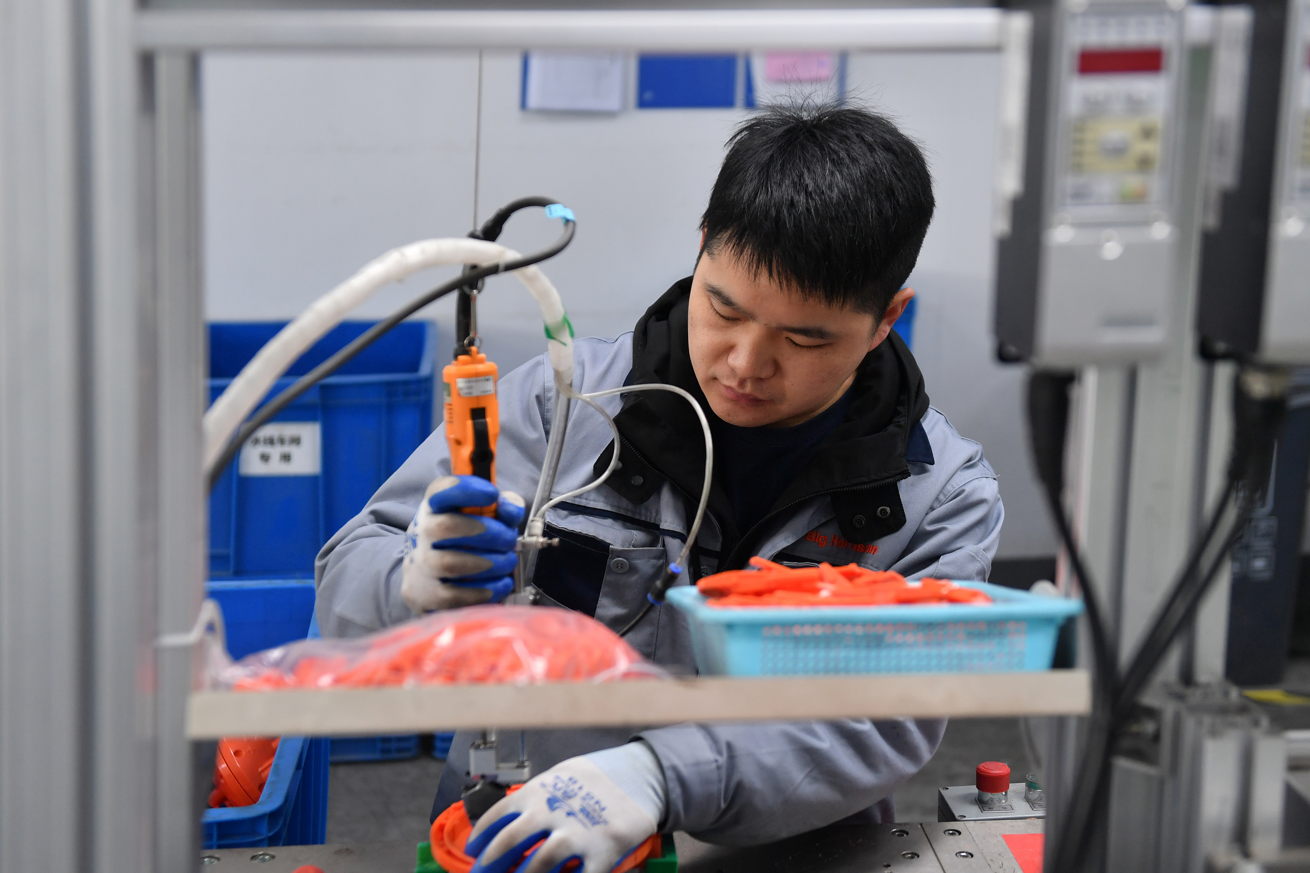 4月7日,在青岛市城阳区流亭大街工业园的一家智能化饲养配备企业出产车间内,工作人员在为设备装置配件。王海边摄