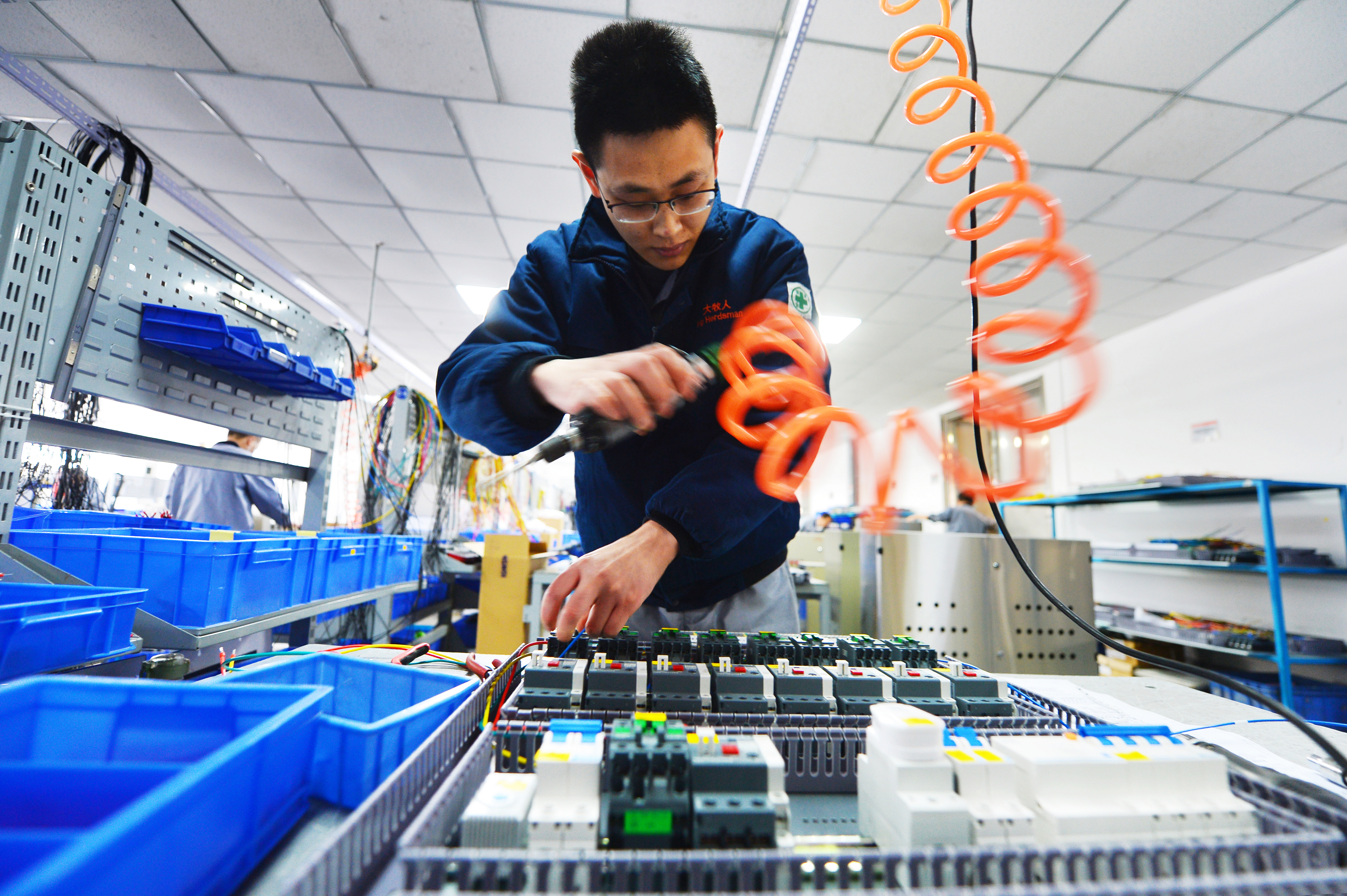 4月7日,在青岛市城阳区流亭大街工业园的一家智能化饲养配备企业出产车间内,工作人员在装置设备操控电路板。王海边摄
