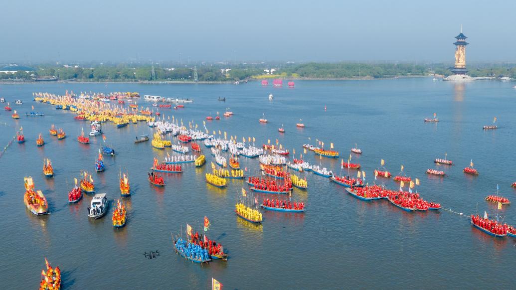 说起水乡,人们会想到小桥流水的烟雨江南,其实在江苏长江以北,里下河区域同样是水网布满,河湖纵横。4月8日,第十六届中国湿地生态旅行节暨2023中国泰州姜堰溱潼会船节开幕,五百多条林林总总的船舶和上万名会船选手一起参加。