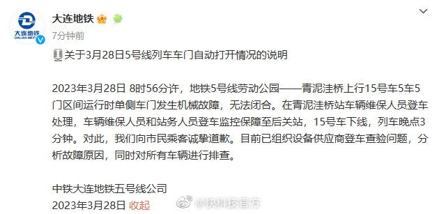据大连地铁官方微博通报,3月28日8时56分许,地铁5号线劳动公园 青泥洼桥上行15号车5车5门区间运行时单侧车门发生机械故障,无法闭合。