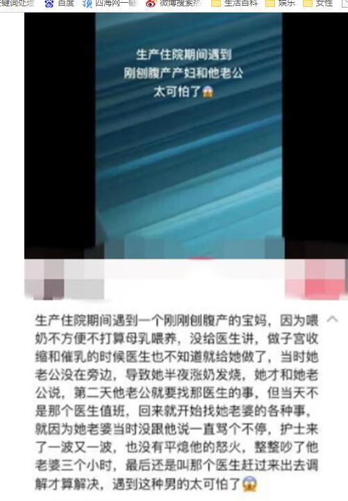 视频发布者配文表示:“生产住院期间,遇到了一个刚剖腹产的宝妈,本来不打算母乳喂养,医生不知道给她做了催乳。当时她丈夫没在,事后也没跟她丈夫说,直到半夜胀奶发烧,她才和丈夫说这事,她丈夫想找医生理论没找到,就整整骂了她3个小时。多名护士来劝不管用,最后还是那个医生来调解,才算解决。”