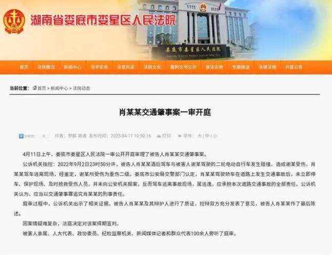 庭审结束后,法院发出通告称,娄底市娄星区人民法院一审公开开庭审理了被告人肖某某交通肇事案。