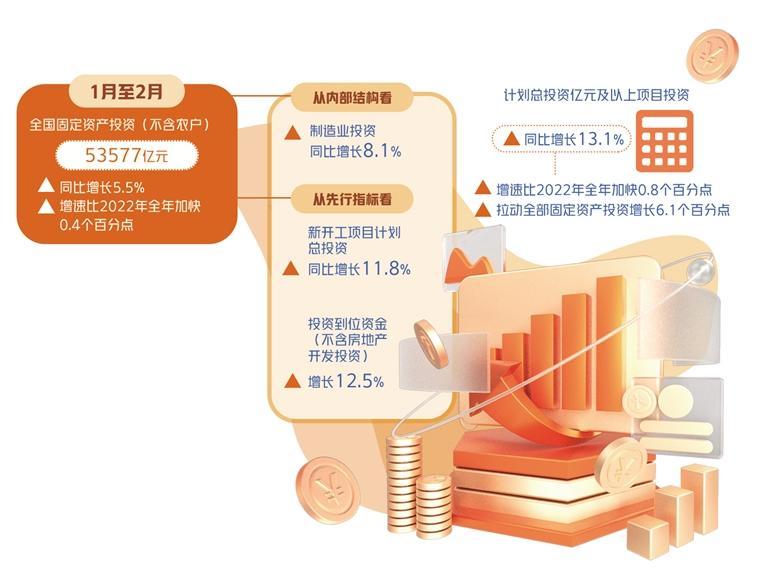 国家统计局数据显现,1月至2月,全国固定资产出资(不含农户)53577亿元,同比增加5.5%,增速比2022年全年加速0.4个百分点。