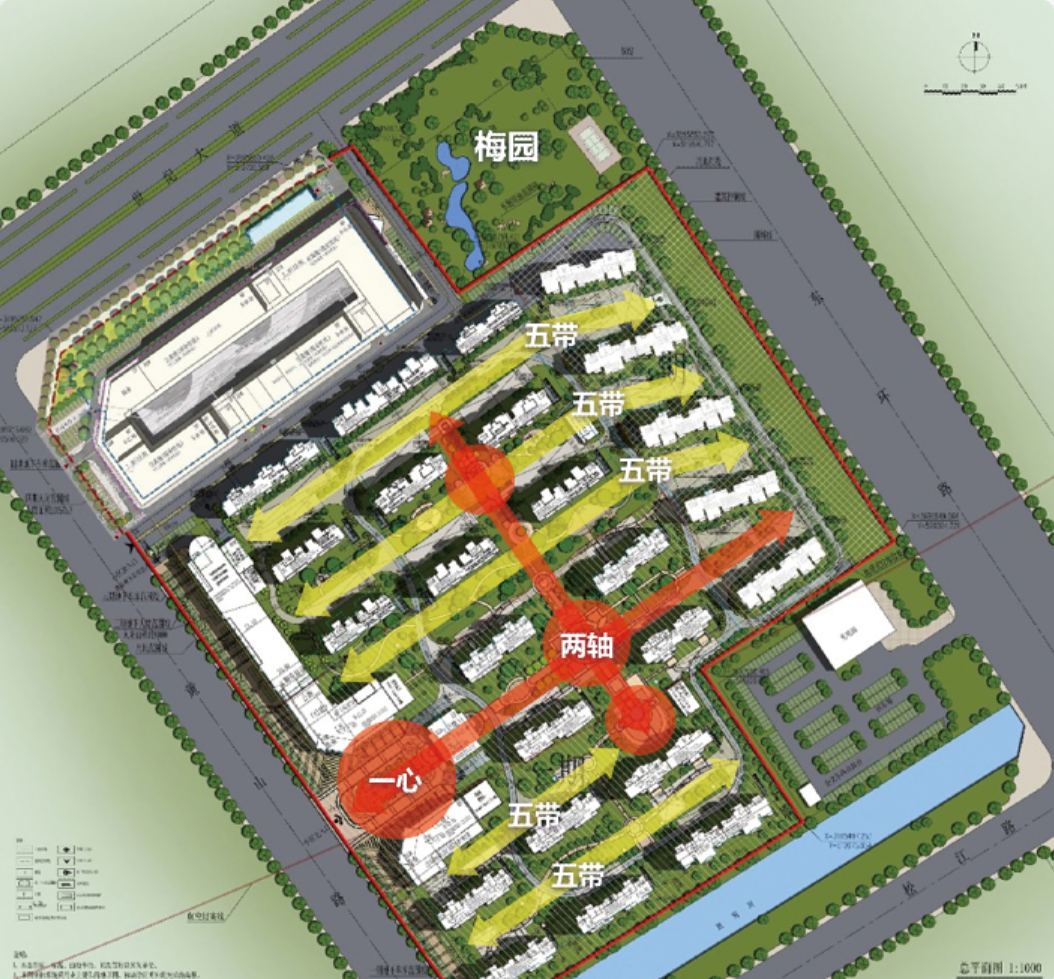 项目外部不只有3大公园盘绕,本身规划绿地率也高达40%,“专心两轴五带多点”高雅园境。