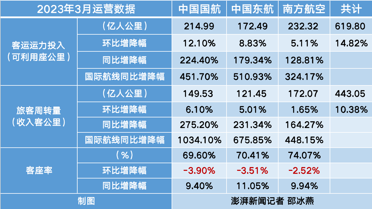3月三大航的首要运营数据。汹涌新闻记者邵冰燕制图