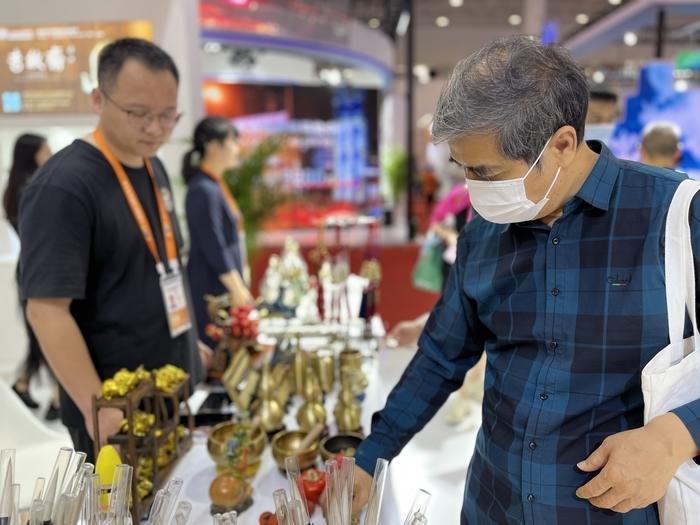 “这是泰山桃木王第2次参与消博会了。2021年首届消博会上,咱们带来了桃木梳、满意、勺子和一些大件的桃木摆件,没想到现场出售一空,与多家海内外客商签下订单,订单金额超300万元,所以本年也是抱着很大等待来参展。”卢国华告知记者。