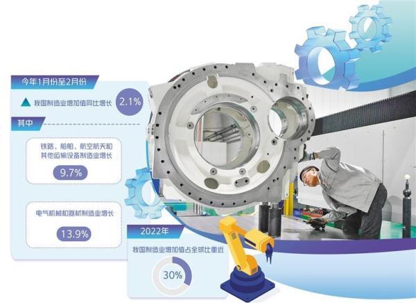 国家统计局最新数据显示,今年1月份至2月份,我国制造业增加值同比增长2.1%。其中,化学原料和化学制品制造业增长7.8%,铁路、船舶、航空航天和其他运输设备制造业增长9.7%,电气机械和器材制造业增长13.9%,表现亮眼。