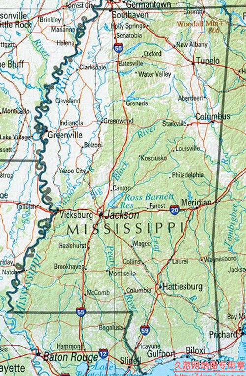 2.美国Missippi州地形交通图下载说明:鼠标移动到地图上方,右键->图片另存为->选择保存的路径;