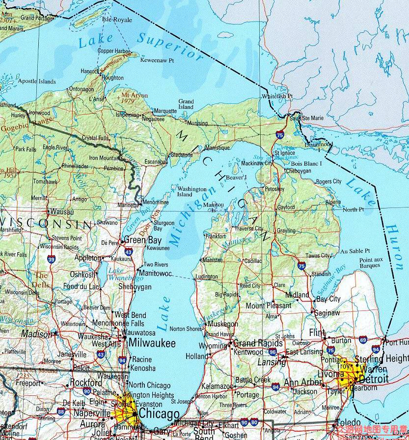 2.美国Michgan州地形交通图下载说明:鼠标移动到地图上方,右键->图片另存为->选择保存的路径;